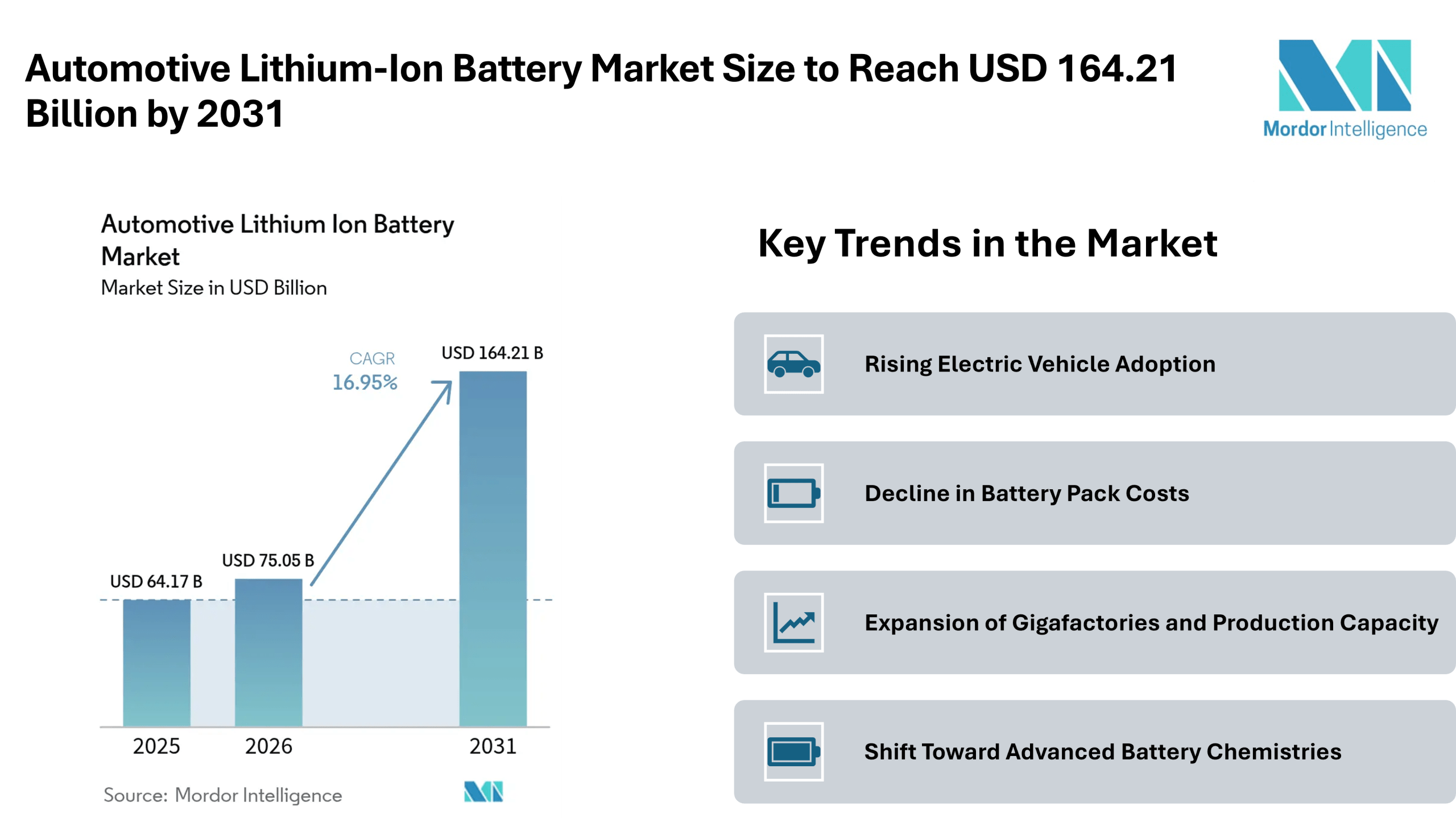 According to Mordor Intelligence, the automotive lithium-ion battery market size is estimated at USD 75.05 billion in 2026, growing from USD 64.17 billion in 2025, and is projected to reach USD 164.21 billion by 2031 at a CAGR of 16.95%. This automotive lithium-ion battery market growth is closely tied to increasing electric vehicle adoption, stricter emission regulations, and ongoing improvements in battery cost and efficiency.