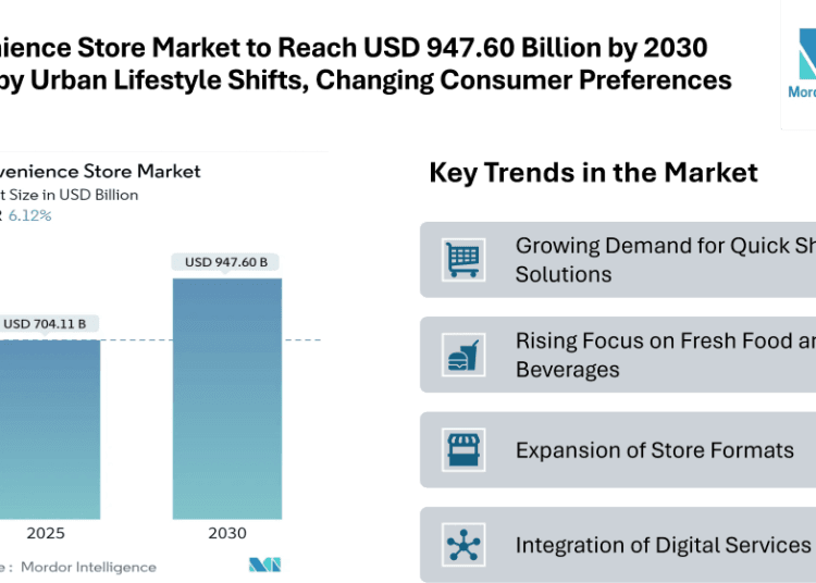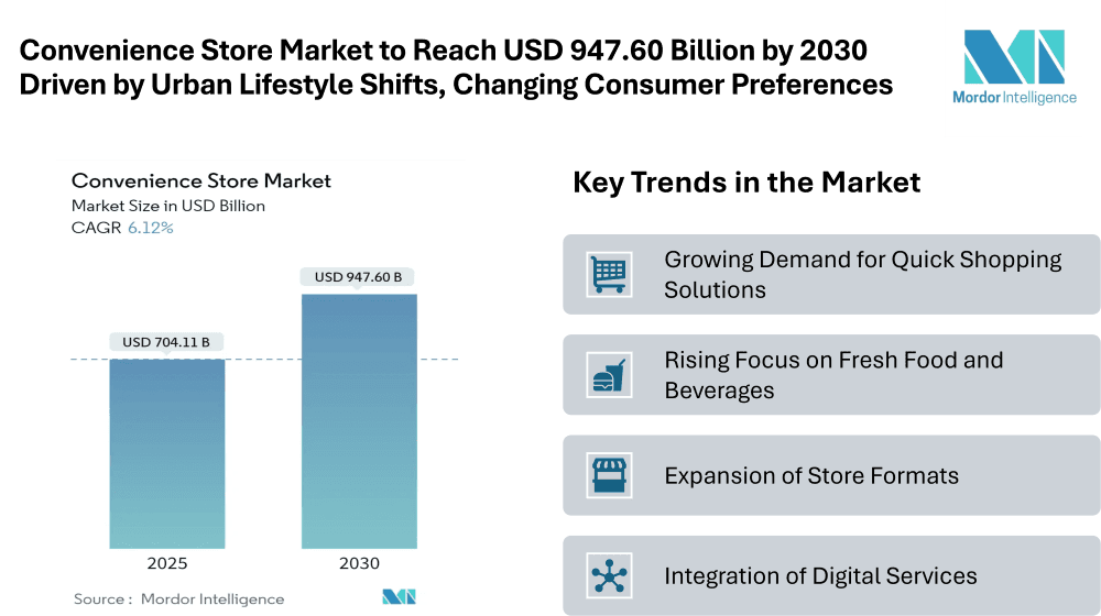 The convenience store market is undergoing steady expansion worldwide, reflecting its vital role in the daily routines of modern consumers. According to the latest convenience store industry report, the market size is projected at USD 704.11 billion in 2025 and is expected to reach USD 947.60 billion by 2030, registering a CAGR of 6.12% during the forecast period. This growth is supported by factors such as urbanization, increasing disposable incomes, and consumers’ demand for quick and hassle-free shopping experiences.