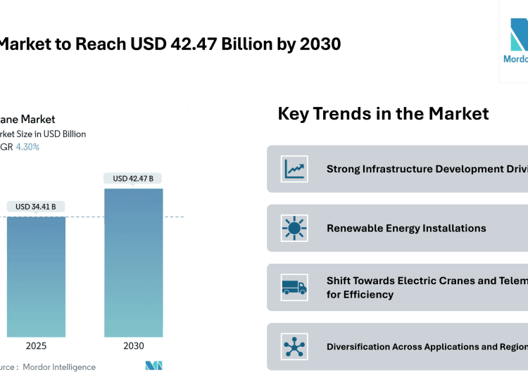 The crane market reached USD 34.41 billion in 2025 and is projected to advance to USD 42.47 billion by 2030, translating into a 4.30% CAGR. This growth is underpinned by a variety of factors, including increased public infrastructure spending, large-scale private megaprojects, and a growing emphasis on renewable energy installations. As the world navigates evolving construction needs and energy transitions, the demand for versatile, high capacity lifting equipment continues to rise.