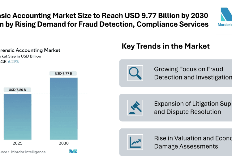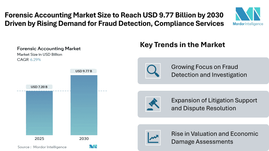 The Forensic Accounting Market is gaining strong momentum worldwide, reflecting the growing emphasis on corporate transparency, fraud prevention, and compliance with tightening regulations. According to recent estimates, the forensic accounting market size is valued at USD 7.20 billion in 2025 and is projected to reach USD 9.77 billion by 2030, advancing at a CAGR of 6.29%. This expansion highlights how businesses, government entities, and financial institutions are increasingly turning to forensic accounting services to strengthen internal controls, investigate irregularities, and resolve disputes effectively.