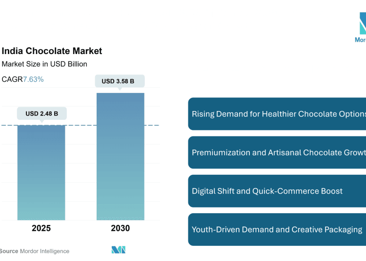 According to a 2025 report on the India Chocolate Market by Mordor Intelligence, the India Chocolate Market Size is projected to grow from USD 2.48 billion in 2025 to USD 3.58 billion by 2030, registering a CAGR of 7.63%. Rising disposable income, evolving consumer preferences, and greater awareness around health and nutrition are reshaping how Indians consume chocolate.