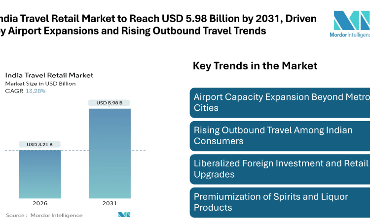 According to Mordor Intelligence, the India travel retail market was valued at USD 2.83 billion in 2025 and estimated to grow from USD 3.21 billion in 2026 to reach USD 5.98 billion by 2031, at a CAGR of 13.28%. Several factors are contributing to this expansion, including upgrades to airport infrastructure, increasing disposable income among the middle class, liberalized foreign investment regulations, and rising outbound travel by Indian consumers.