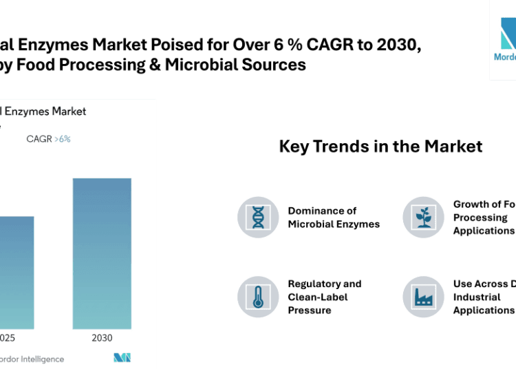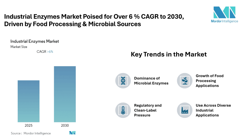 The global Industrial Enzymes Market is entering a period of steady growth. According to a recent Mordor Intelligence report, the market is expected to expand at a compound annual growth rate (CAGR) of over 6 % during the forecast period 2025-2030. While precise dollar figures are not disclosed in that report summary, growth is underpinned by increasing demand across food processing, detergents, biofuels, healthcare and other industrial sectors.