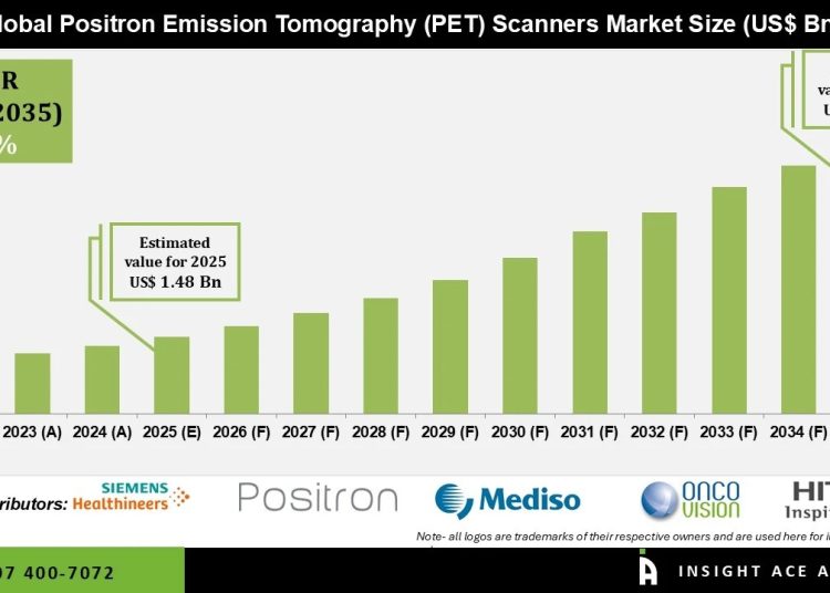 InsightAce Analytic Pvt. Ltd. announces the release of a market assessment report on the “Global Positron Emission Tomography (PET) Scanners Market Size, Share & Trends Analysis Report By Detector Type (Bismuth Germanium Oxide, Lutetium Fine Silicate, Gadolinium Oxyorthosilicate, Lutetium Oxyorthosilicate, and Lutetium Yttrium Orthosilicate), Product Type (Full-ring PET Scanner and Partial-ring PET Scanner), Application (Oncology, Cardiology, Neurology, and Others), End-user (Hospitals, PET Centers, Diagnostic Centers, and Research Institute),- Market Outlook And Industry Analysis 2035″