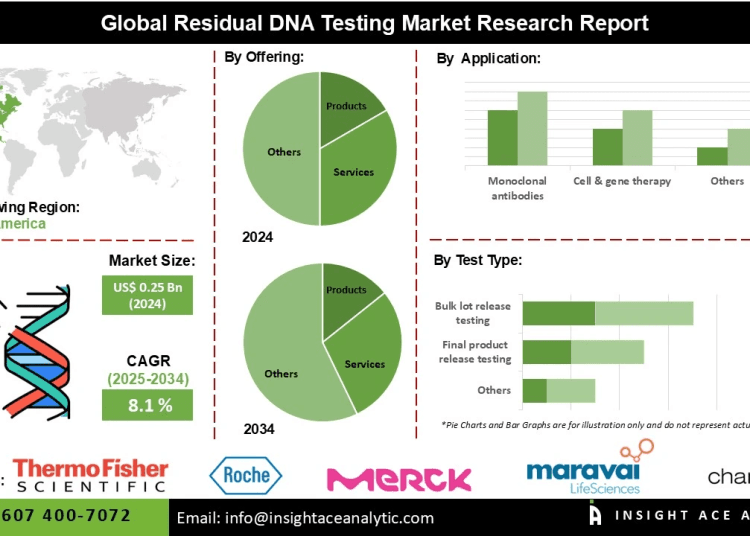 InsightAce Analytic Pvt. Ltd. announces the release of a market assessment report on the “Global Residual DNA Testing Market Size, Share & Trends Analysis Report Offering (Product {Consumables, and Instruments & Software}, and Services), by Test Type (Final Product Release Testing, Bulk Lot Release Testing, and Raw Material Testing), By Technology (Polymerase Chain Reaction, Threshold Assay, DNA Probe Hybridization, and Other Technologies), By Application (Monoclonal Antibodies, Cell & Gene Therapy, Vaccines, And Other Applications), By End-User (Pharmaceutical & Biotechnology Companies, CROS & CDMOS, And Academic & Research Institutes)-Market Outlook And Industry Analysis 2034″