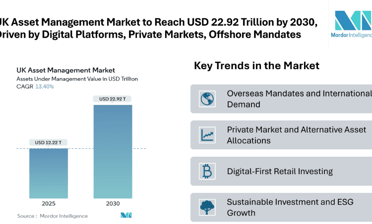 The UK Asset Management Market is projected to grow from USD 12.22 trillion in 2025 to USD 22.92 trillion by 2030, registering a CAGR of 13.40%. This growth underscores the expanding UK asset management market share and reinforces its role as a key pillar of the financial services sector.