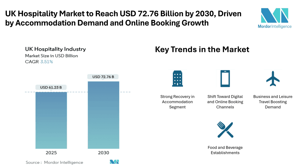 The hospitality industry in UK plays a vital role in supporting tourism, business travel, and domestic leisure. With a strong base of hotels, restaurants, pubs, and foodservice establishments, the market continues to serve both local and international demand. According to the latest UK hospitality market report, the industry is valued at USD 61.23 billion in 2025 and is forecast to reach USD 72.76 billion by 2030, reflecting a steady 3.51% CAGR during the forecast period.