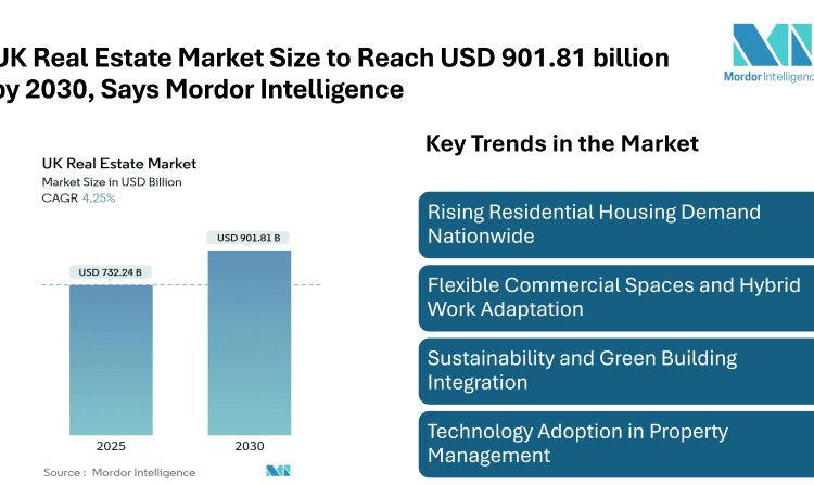 According to Mordor Intelligence, the UK Real Estate Market size is estimated at USD 732.24 billion in 2025 and is expected to reach USD 901.81 billion by 2030, at a CAGR of 4.25%. The outlook for the UK real estate market share reflects continued expansion in urban hubs while supporting regional development projects, positioning the sector as a key contributor to the overall real estate landscape in the UK.