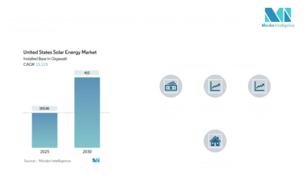 United States Solar Energy Market is on track to nearly double from 203.85 gigawatts (GW) in 2025 to a substantial 412 GW by 2030, reflecting a strong 15.11% compound annual growth rate (CAGR) over the period. With solar now the fastest‑growing source of new electricity capacity in the country, this growth is shaped by a confluence of policy support, surging domestic production, and sharp cost declines. This release outlines the key trends, market breakdowns, and major players steering the industry forward.